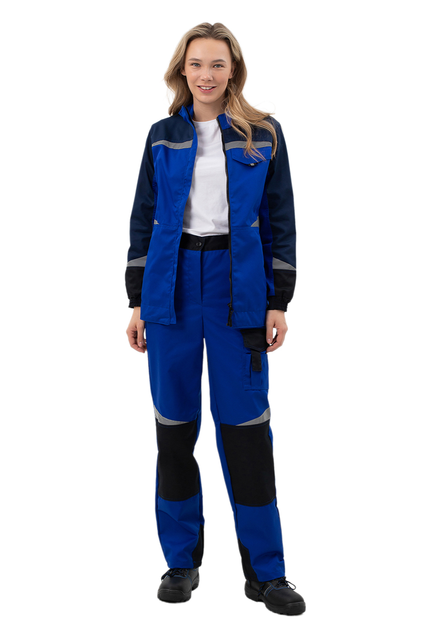 ➠ Брюки с застежкой на молнию, с притачным поясом, стянутым резинкой в области боковых швов для лучшей посадки на фигуре, пояс со шлёвками. Застежка пояса на пуговицу. Брюки с боковыми карманами с наклонной линией входа, с наколенниками и усилениями по шаговому шву. На задней половинке брюк фигурный накладной карман. На боковом шве брюк расположен накладной многофункциональный карман с фигурным клапаном и застежкой на липучку. Костюм со светоотражающими фигурными полосами для лучшей видимости в темное время суток.