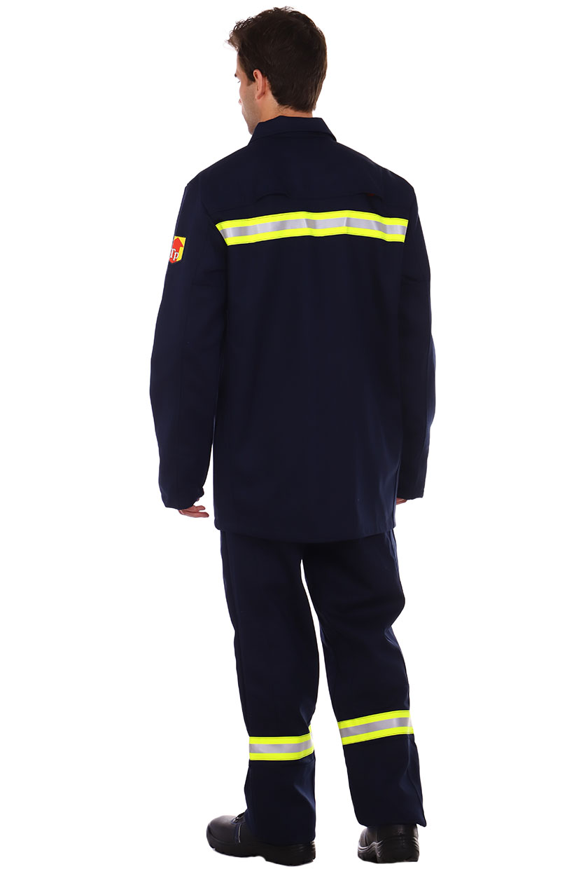 ➠ Брюки с притачным поясом, застежка гульфика на пуговицы. На правой передней половинке – накладной карман с клапаном. Передние половинки с усилительными накладками от линии бедра до низа с заходом на боковые швы. Брюки с бретелями. Нитки и фурнитура огнестойкие. По низу брюк расположен СОП 50 мм, огнестойкий.